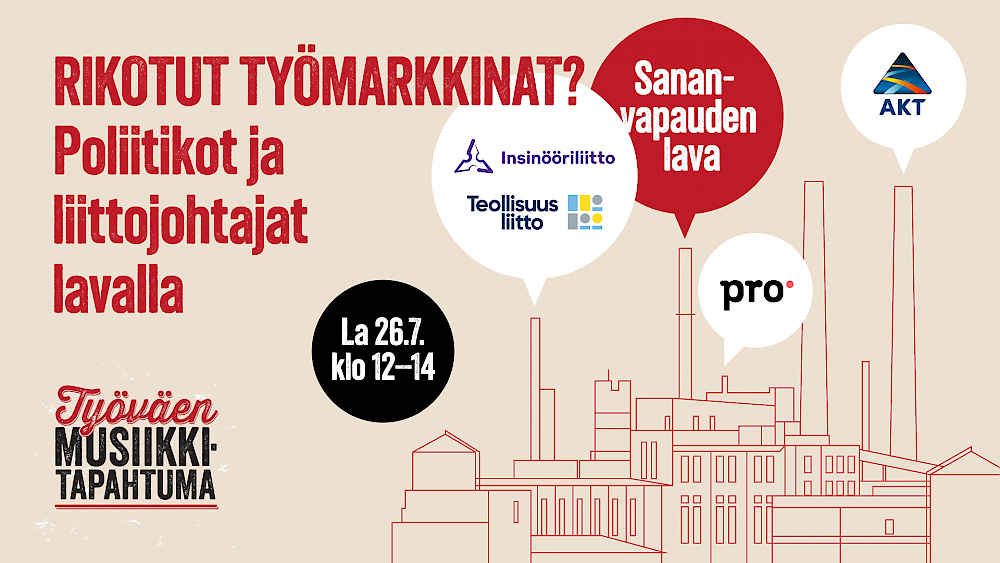 FESTARIOHJELMAN rinnalla Työväen Musiikkitapahtumassa jälleen myös asiallista työelämäasiaa. Tule kuulolle Sananvapauden lavan ääreen lauantaina 26.7. klo 12–14 välisenä aikana. Keskusteluissa kansanedustajien kanssa ammattiliitot: AKT, Pro, Teollisuusliitto ja Insinööriliitto.